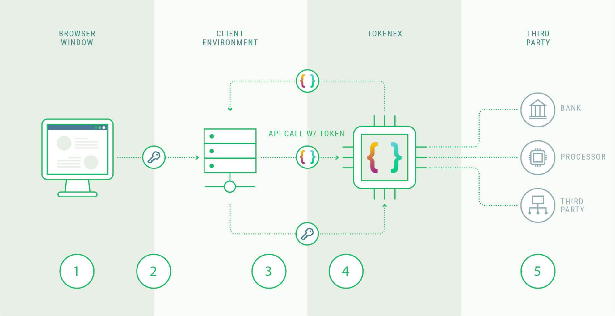 | 4. TokenEx returns the token to the client's server. The TokenEx client can then send the tokenized data to a third-party such as a payment gateway, using the Payment Services API or Transparent Gateway API. |